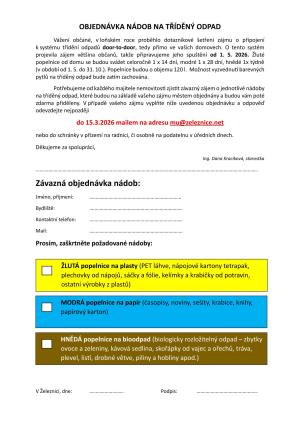 Vážení občané, v příloze naleznete objednávku nádob na tříděný odpad v rámci systému třídění odpadů door-to-door, jehož spuštění plánuje město od 1. 5. 2026. V případě závazného zájmu ji prosím v počítači vyplňte a zašlete ji nejpozději do 15. 3. 2026 na e-mailovou adresu mu@zeleznice.net.