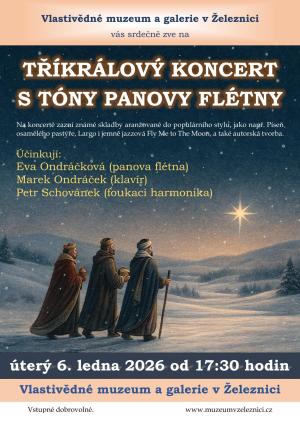Srdečně vás zveme v úterý 6. ledna 2026 od 17:30 hodin do Vlastivědného muzea a galerie v Železnici na „Tříkrálový koncert s tóny panovy flétny“. Účinkují: Eva Ondráčková (panova flétna), Marek Ondráček (klavír), Petr Schovánek (foukací harmonika). Vstupné dobrovolné.