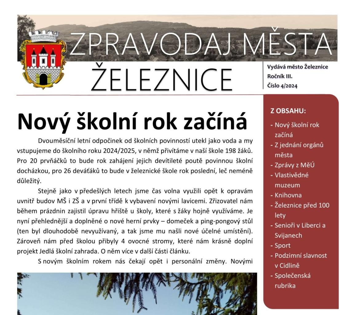 Přečtěte si nové, 4. číslo Zpravodaje města Železnice, která vyšlo na přelomu srpna a září. Najdete v něm informace k novému školnímu roku v místní ZŠ, informace z jednání orgánů města, aktuální informace o dění ve městě, pozvánky na kulturní a společenské akce i ohlédnutí za proběhlými událostmi.