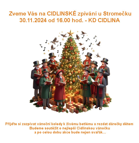 Srdečně vás zveme v sobotu 30. listopadu od 16 hodin ke KD Cidlina na Cidlinské zpívání u stromečku. Přijďte si zazpívat koledy u živého betlému, rozdat dárečky dětem, zasoutěžit si o nejlepší vánočku nebo se posilnit voňavým svařákem.