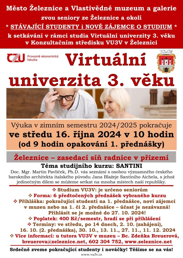Jste v seniorském věku a máte chuť dozvídat se stále nové poznatky? Zapojte se do studia Virtuální univerzity 3. věku (VU3V) v konzultačním středisku (KS) v Železnici. Nový semestr s přednáškovým kurzem SANTINI začal ve středu 2. 10. 2024, pokračuje 2. přednáškou 16. 10. 2024. Přijďte mezi nás!