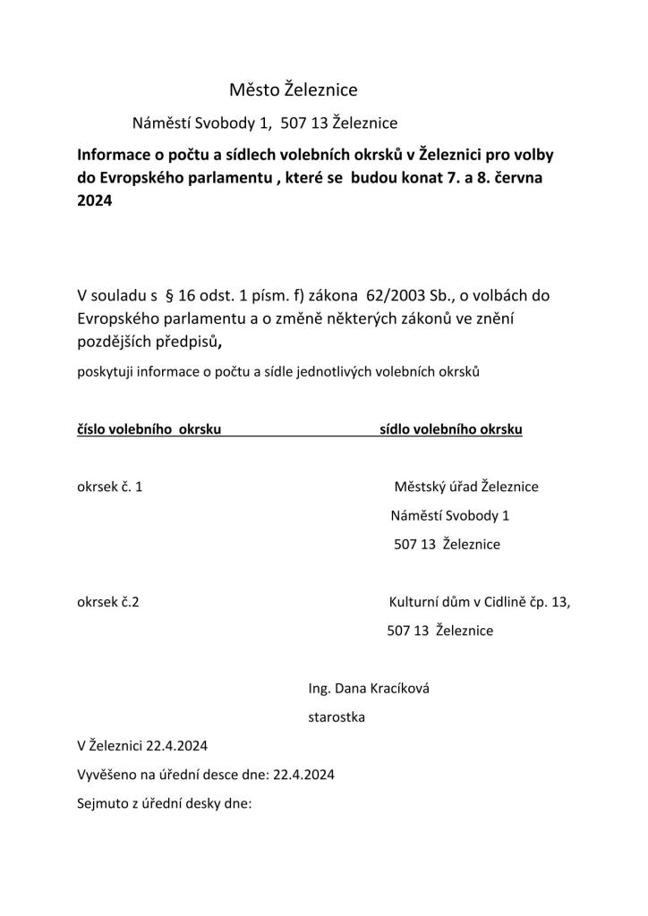 Informace o počtu a sídlech volebních okrsků v Železnici pro volby do Evropského parlamentu, které se budou konat 7. a 8. června 2024 - viz příloha.