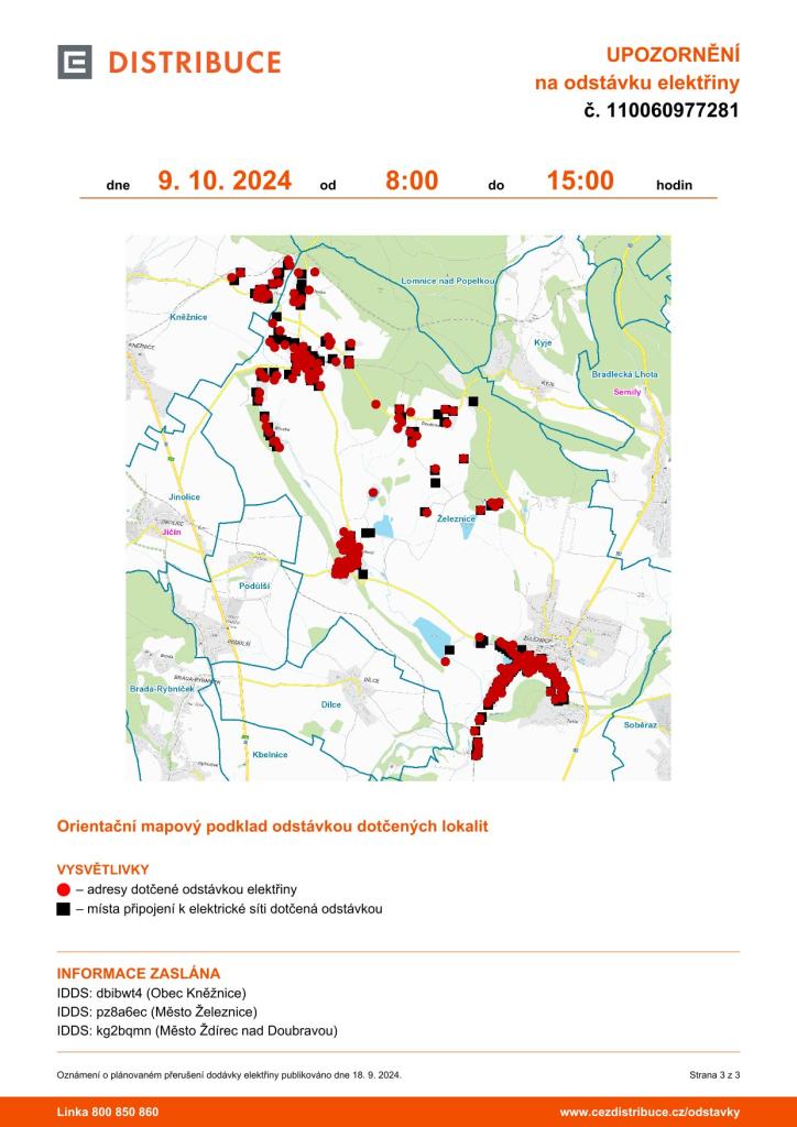 Odstávka elektřiny dne 9. 10. 2024 od 8 do 15 hodin se týká lokalit a čp. v Železnici (Březka, Cidlina, Doubravice, Pekloves, Zámezí, Železnice) a Kněžnice, které najdete v seznamu v příloze. Děkujeme za pochopení.