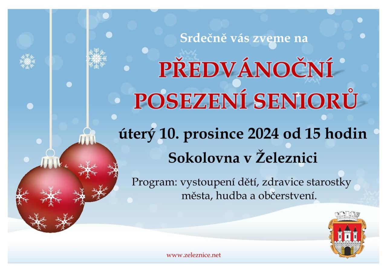 Město Železnice srdečně zve seniory na PŘEDVÁNOČNÍ POSEZENÍ, které se koná v úterý 10. prosince od 15 hodin v sokolovně v Železnici. Připravený program zahrnuje vystoupení dětí, zdravici starostky města, hudbu a občerstvení.