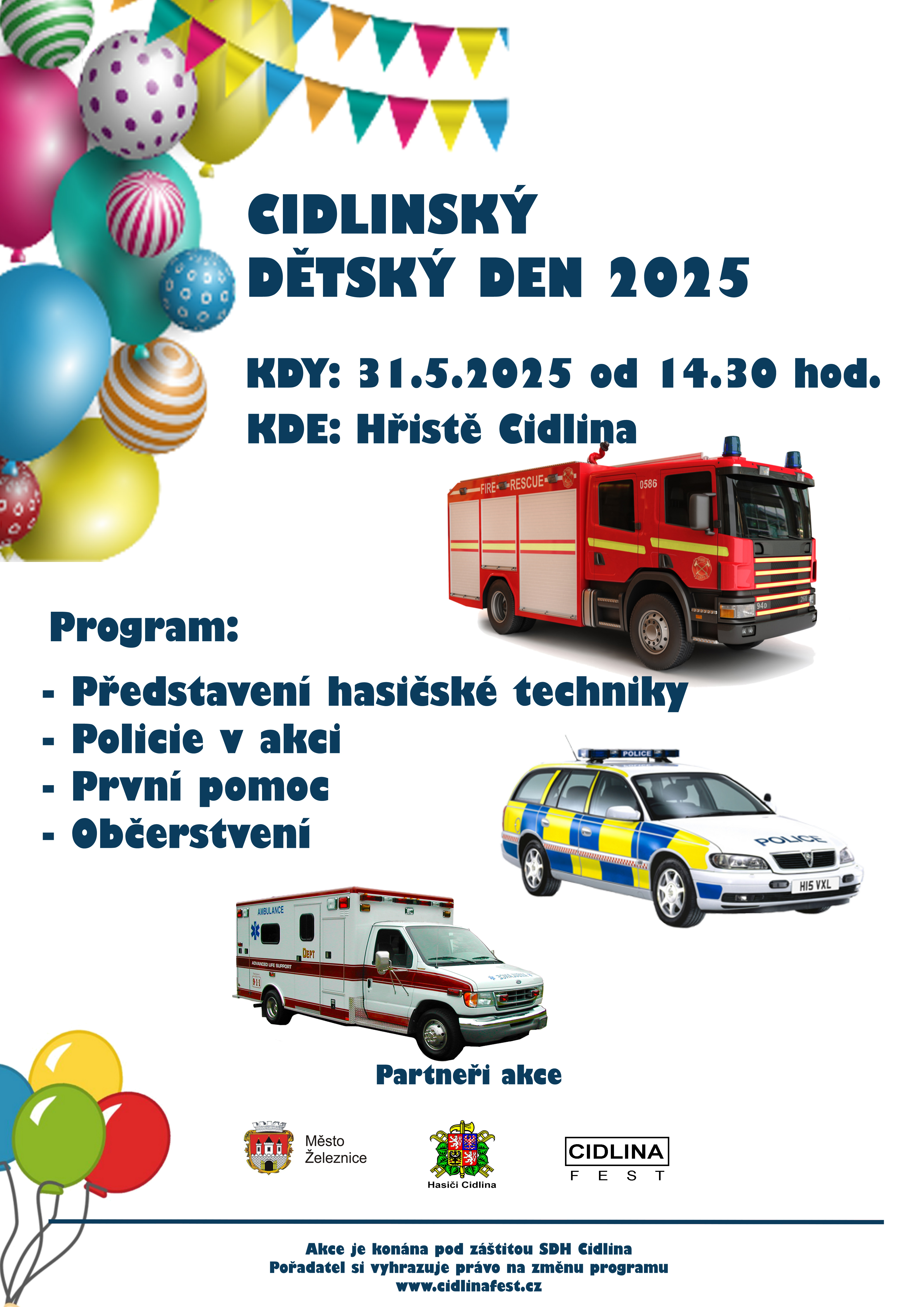 Nenechte si ujít v sobotu 31. května od 14:30 hodin Cidlinský dětský den 2025, který se koná na hřišti v Cidlině u Železnice. Program: představení hasičské techniky, policie v akci, první pomoc, občerstvení. Srdečně vás zveme.