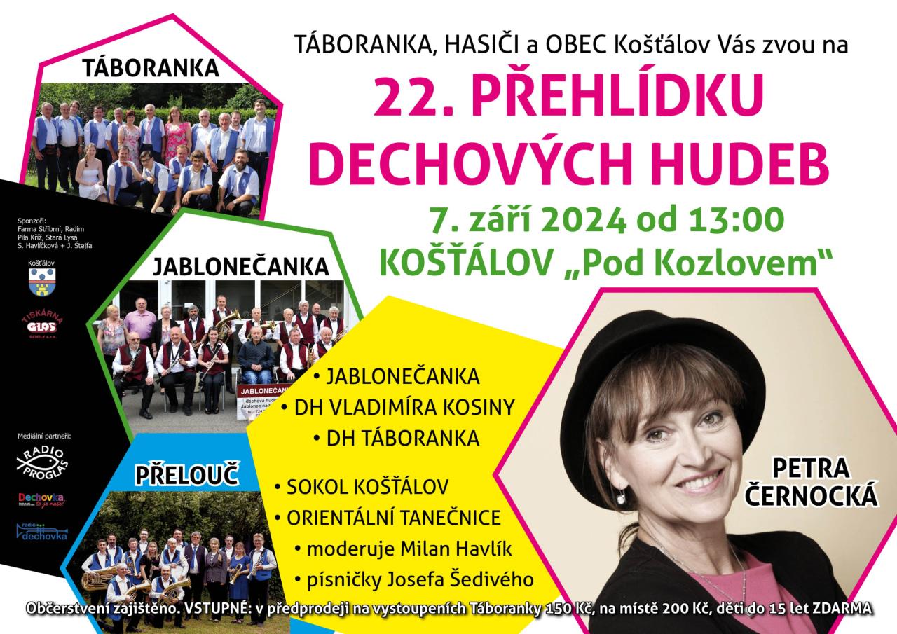 Srdečně vás zveme na již 22. Přehlídku dechových hudeb v Košťálově, která se koná v sobotu 7. září od 13 hodin v hasičském areálu Pod Kozlovem v Košťálově. Vedle dechových hudeb, sokolů a orientálních tanečnic vystoupí i PETRA ČERNOCKÁ. Více informací na plakátě a v programu.