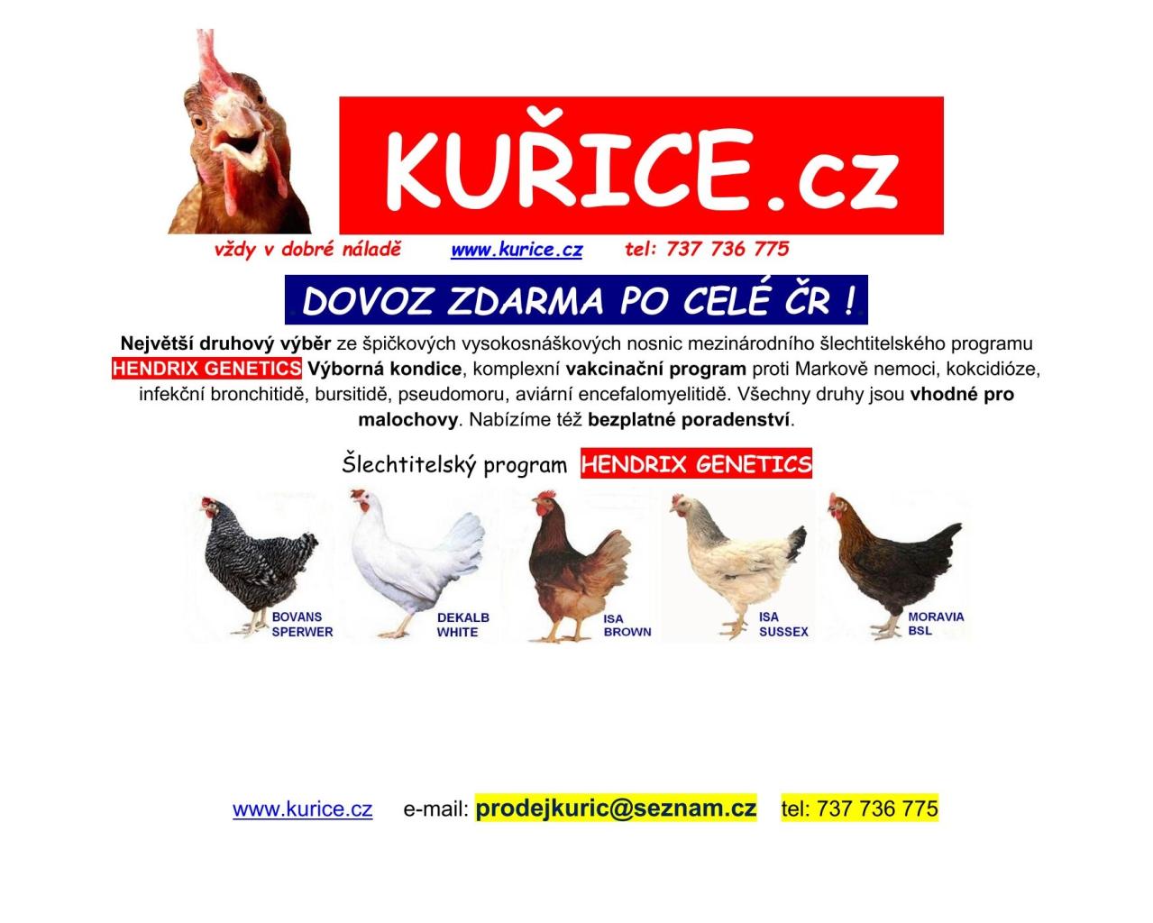 Chcete rozšířit či omladit svůj domácí chov slepic? Firma Kuřice s. r. o. nabízí možnost objednat si kvalitní kuřice s dodáním až domů, čímž vám odpadnou starosti s jejich sháněním a přepravou. Další informace a číslo telefonu pro objednání naleznete na letáčku v příloze. Více také na www.kurice.cz.