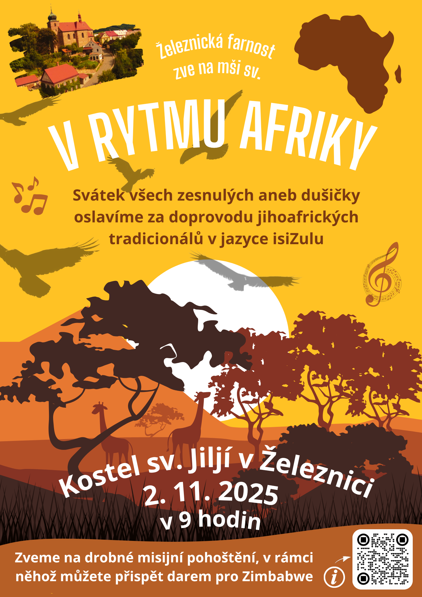 A protože je „AFRIKA V ŽELEZNICI“ naplánována na „Dušičky“ 2. 11. 2025, bude se při bohoslužbě vzpomínat i na blízké zemřelé. Každý návštěvník proto při vstupu do kostela dostane svíčku a bude mít možnost zapálit ji za někoho ze svých blízkých zemřelých.