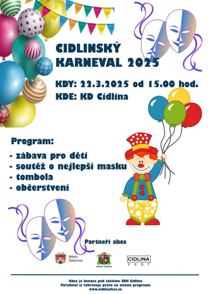 Jste srdečně zváni na tradiční dětský Cidlinský karneval, který se koná v sobotu 22. března 2025 od 15 hodin v KD Cidlina. Připravena je zábava pro děti, dále soutěž o nejlepší masku, tombola i chutné občerstvení.