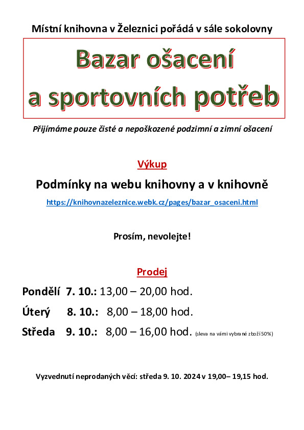 Srdečně vás zveme k nákupu na tradičním podzimním Bazaru ošacení a sportovních potřeb, pořádaném městskou knihovnou, který se koná od 7. do 9. října v sokolovně v Železnici. Kdy můžete nakupovat? V pondělí 7. 10. od 13 do 20 hodin, v úterý 8. 10. od 8 do 18 hodin, ve středu 9. 10. od 8 do 16 hodin.