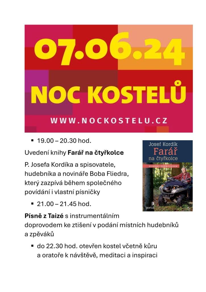 * 19.00 – 20.30 hodin: Uvedení nové knihy Farář na čtyřkolce P. Josefa Kordíka a spisovatele, hudebníka a novináře Boba Fliedra, který zazpívá během společného povídání i vlastní písničky.