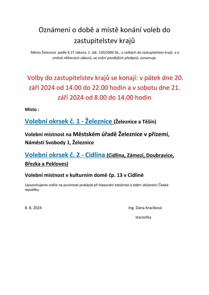 Oznámení o době a místě konání voleb do zastupitelstev krajů 20. a 21. 9. 2024 v Železnici - viz příloha. Datum vyvěšení na úřední desku: 8. 8. 2024.