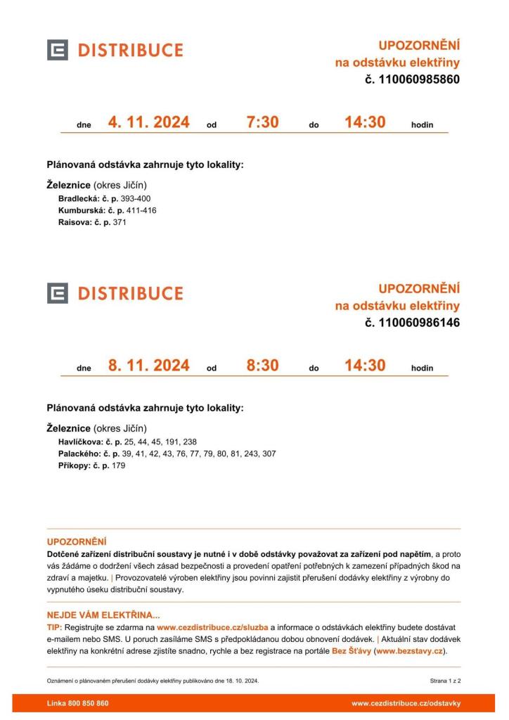 Podobnější informace o adresách a číslech popisných (i parcelní čísla) v Železnici, kterých se odstávka dodávky elektrické energie v daných termínech 4. a 8. 11. 2024 týká, naleznete v příloze nebo v sekci ČEZ Odstávky na titulní stránce městského webu www.zeleznice.net.