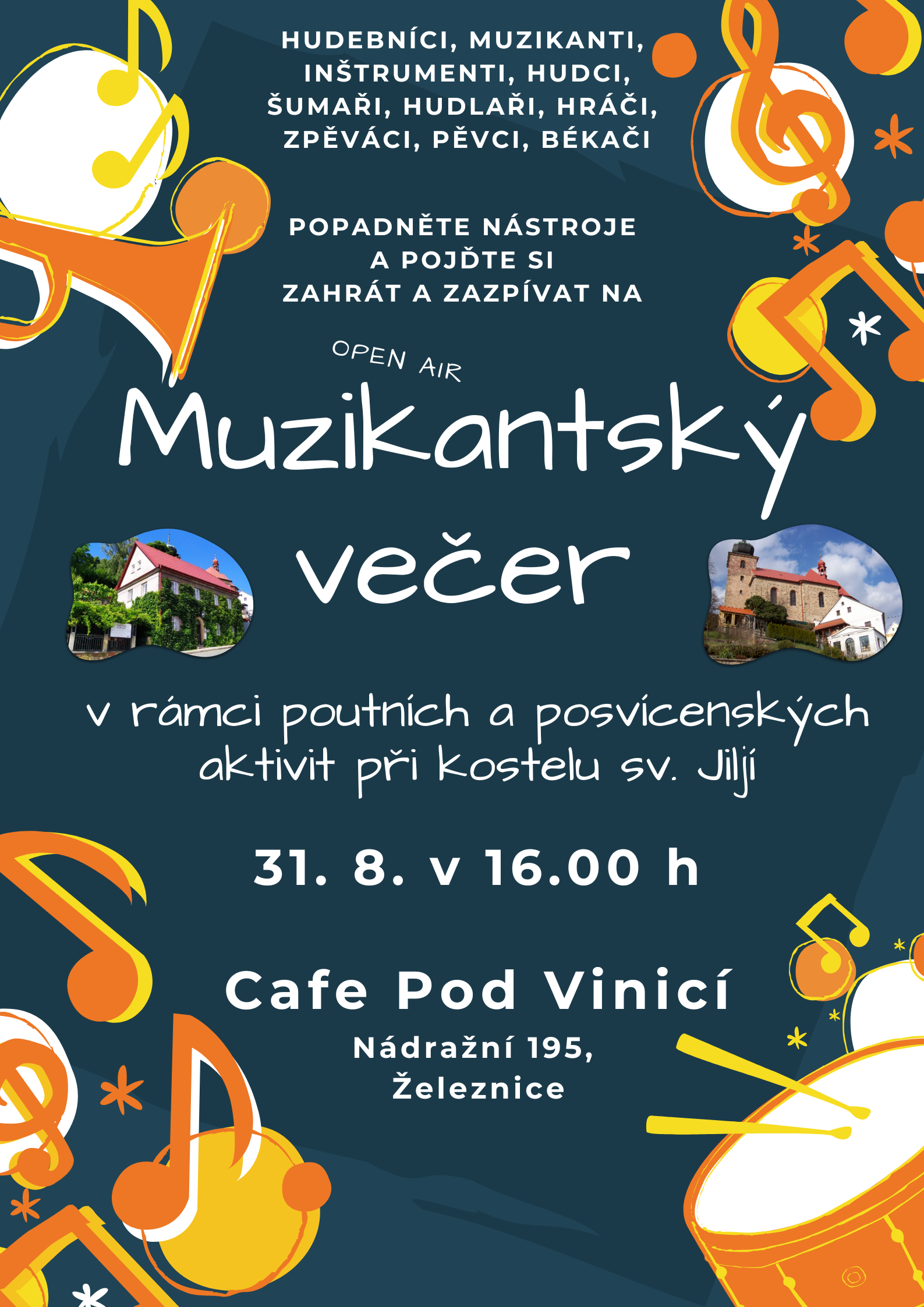 Hudebníci, muzikanti, inštrumenti, hudci, šumaři, hudlaři, hráči, zpěváci, pěvci, békači... popadněte instrumenty a pojďte si zahrát a zapívat na open air MUZIKANTSKÝ VEČER, který se koná v rámci Pouti a posvícení v Železnici v sobotu 31. srpna 2024 od 16 hodin v Kafé Pod Vinicí v Železnici.