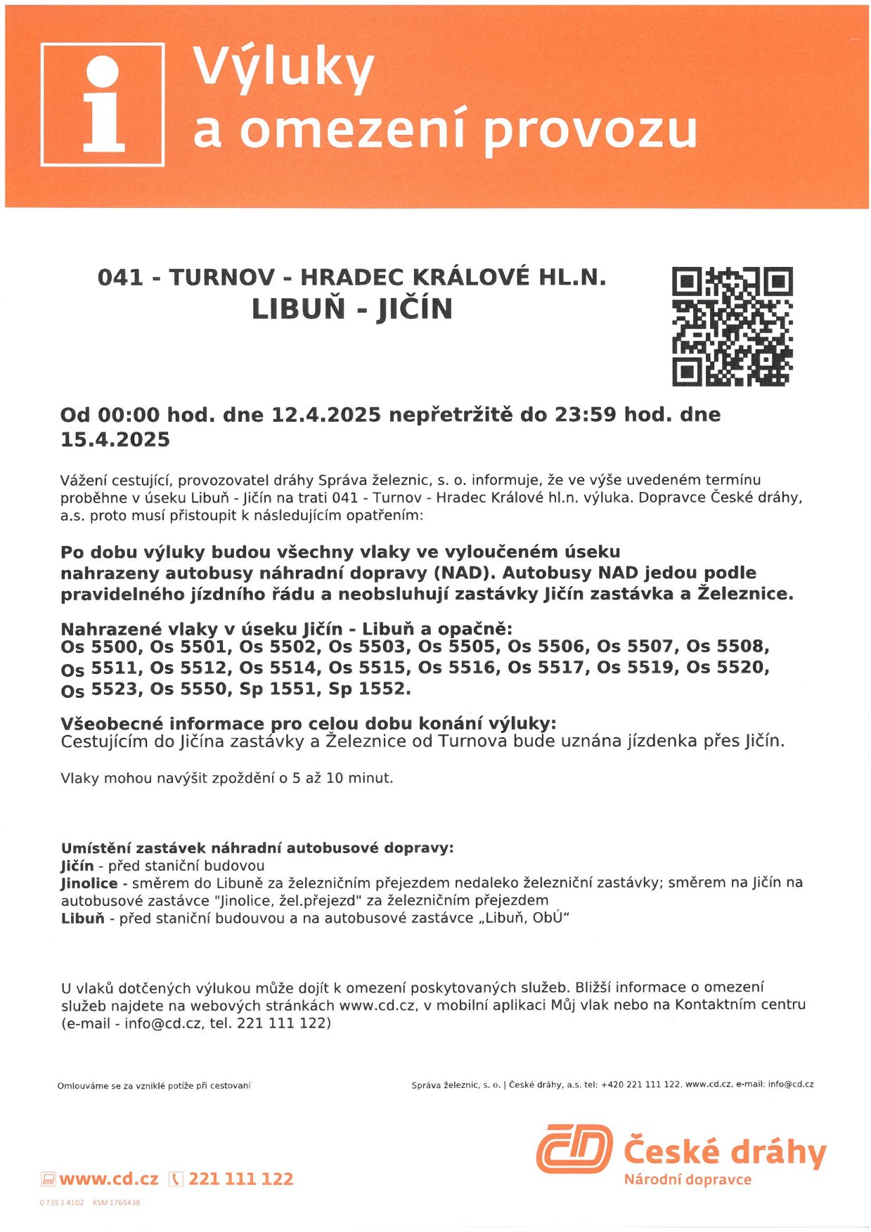 Správa železnic si dovoluje informovat cestující o plánované výluce na železniční trati ČD 041 Turnov - Hradec Králové v úseku Jičín - Libuň v termínu 12.-15. 4. 2025. Zavedena bude náhradní autobusová doprava (NAD). Pozor, zastávka Železnice nebude NAD po dobu výluky obsluhována! Více v příloze.