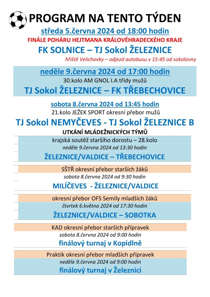 Srdečně vás zveme na fotbalové utkání 30. kola AM GNOL I. A třídy mužů TJ Sokol ŽELEZNICE – FK TŘEBECHOVICE, které bude odehráno na fotbalovém hřišti v Železnici v neděli 9. června 2024 od 17 hodin. Rozpis ostatních utkání naleznete na plakátě v příloze.