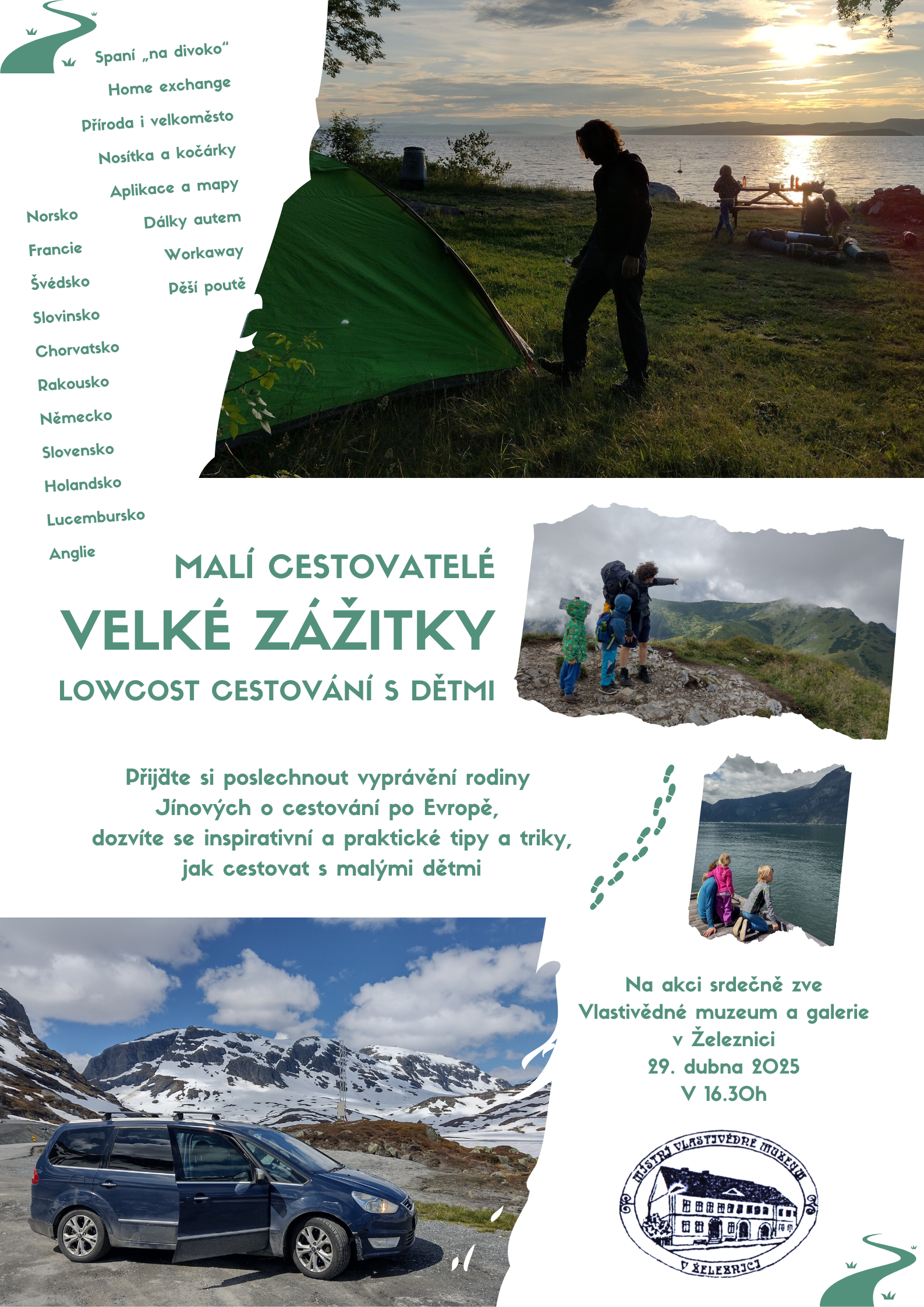 Přijďte si poslechnout vyprávění pětičlenné rodiny Jínových o cestování po Evropě. Dozvíte se praktické tipy a triky, jak cestovat s malými dětmi. Inspirativní dobrodružství, svobodně a levně.