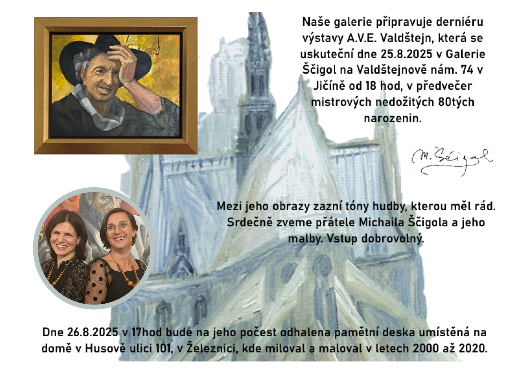 V jejich předvečer v pondělí 25. 8. proběhne v 18 hodin v Galerii Michaila Ščigola na Valdštejnově náměstí v Jičíně derniéra výstavy jeho obrazů A.V.E. Valdštejn. Mezi jeho obrazy zazní tóny hudby, kterou měl rád. Srdečně jsou zváni přátele Michaila Ščigola a jeho malby. Vstup dobrovolný.