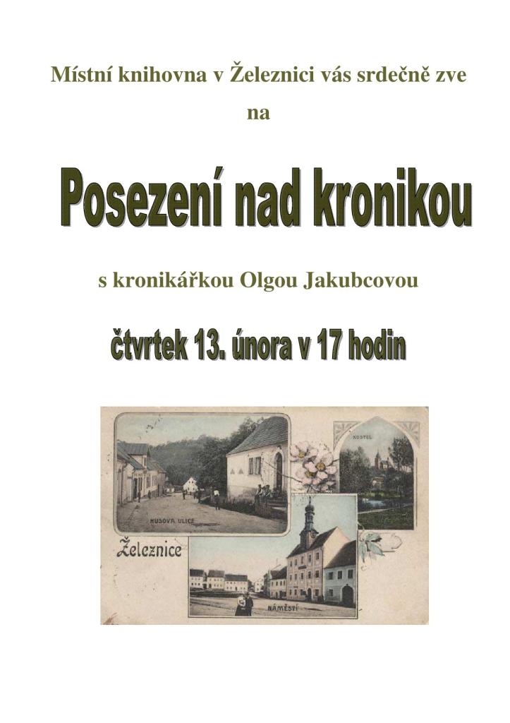 Zajímavá vás, co se v minulosti událo v Železnici, jak jsou události zaznamenány v městské kronice, jak kronika vzniká a kdo ji vytváří? Pak právě vás zve Místní knihovna v Železnici na Posezení nad kronikou s kronikářkou Olgou Jakubcovou, jež se koná ve čtvrtek 13. února od 17 hodin v knihovně.