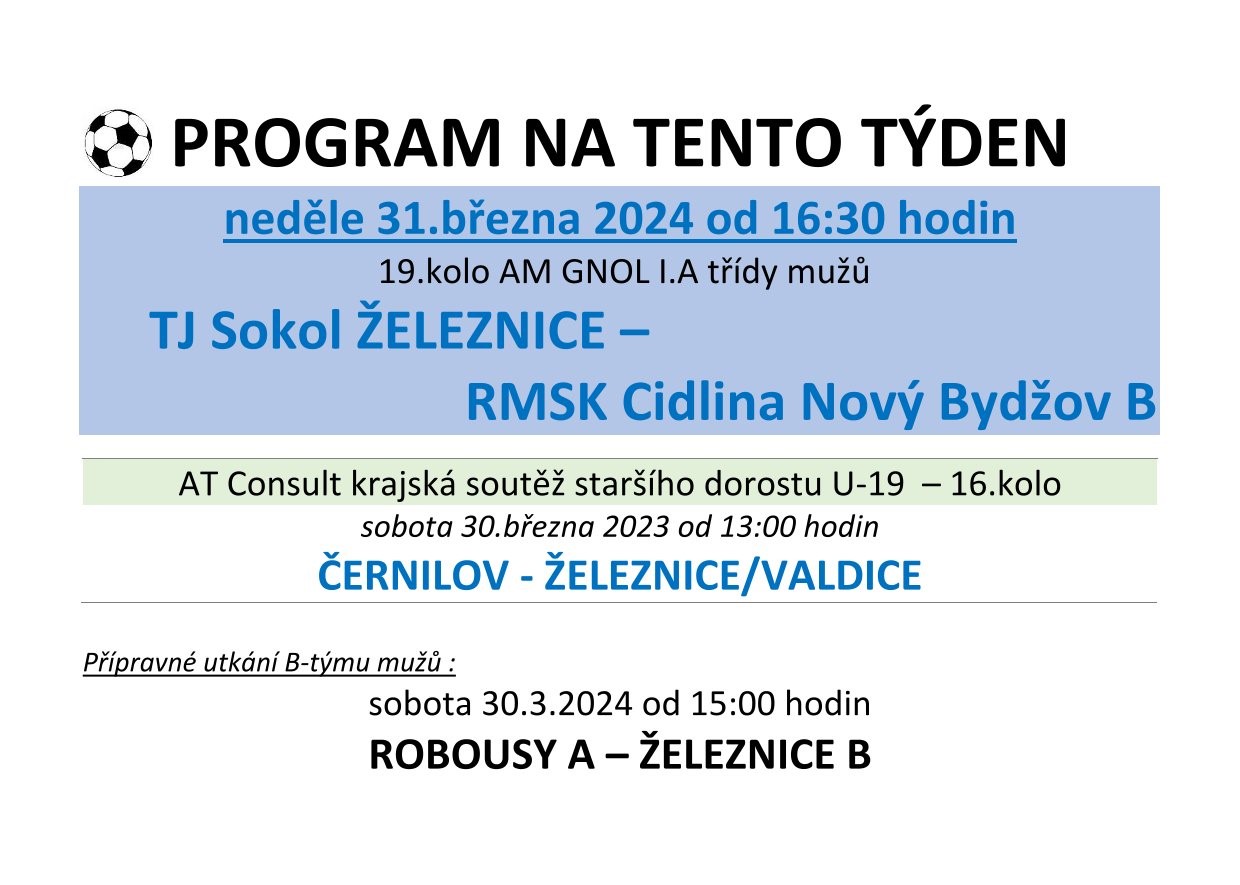 V sobotu 30. března proběhne od 13 hodin fotbalové utkání AT Consult krajská soutěž staršího dorostu U-19 – 16. kolo ČERNILOV - ŽELEZNICE/VALDICE, od 15 hodin přípravné utkání B-týmu mužů ROBOUSY A – ŽELEZNICE B.