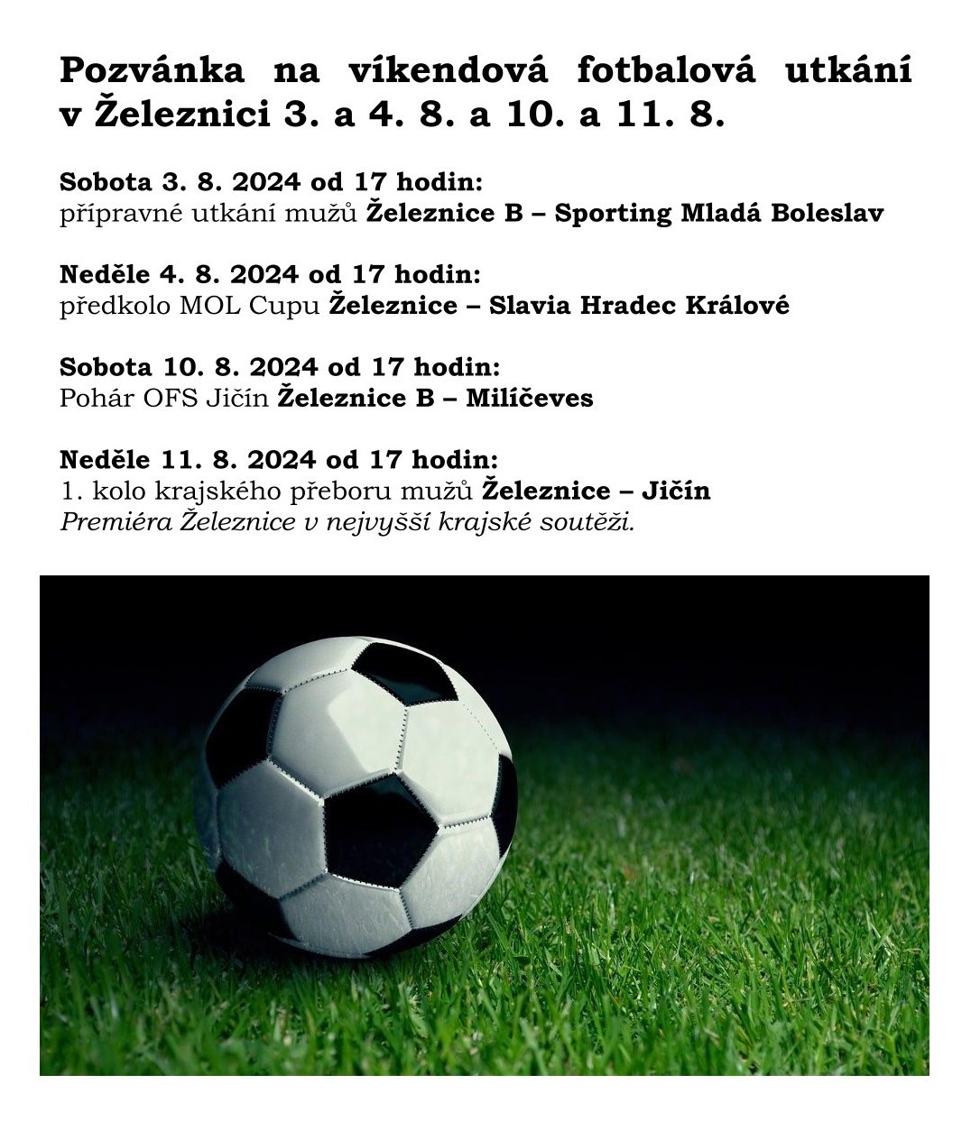 Srdečně vás zveme na fotbalové utkání na fotbalovém hřišti v Železnici o víkendech 3. a 4. srpna a 10. a 11. srpna 2024. Tak neváhejte a přijďte fandit domácím fotbalistům!