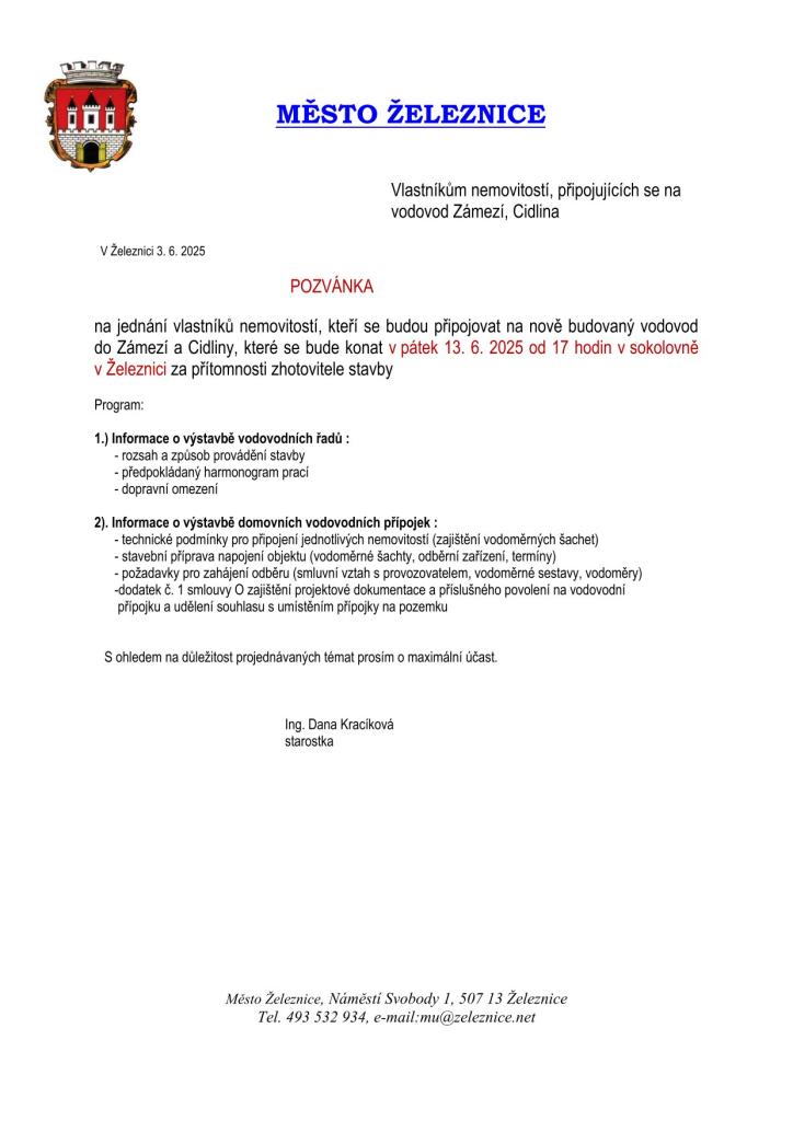 Město Železnice zve vlastníky nemovitostí, kteří se budou připojovat na budovaný vodovod Zámezí –Cidlina, na jednání o této stavební akci. Proběhne za přítomnosti zhotovitele stavby v pátek 13. června od 17 hodin v sokolovně v Železnici. Podrobnější informace naleznete v pozvánce.