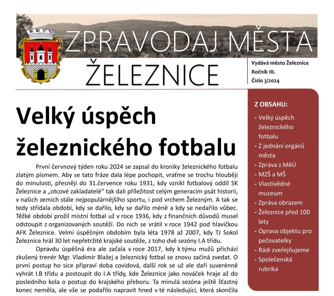 Přečtěte si nejnovější, 3. číslo letošního ročníku Zpravodaje města Železnice, která vyšlo začátkem července a ve kterém najdete článek o velkém úspěchu železnického fotbalu, informace z jednání orgánů města, aktuální informace o dění ve městě, pozvánky na akce i ohlédnutí za proběhlými událostmi.