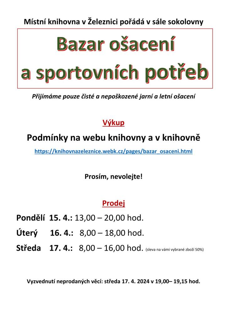 Vyzvednutí neprodaných věcí: středa 17. 4. 2024 v 19,00– 19,15 hod.