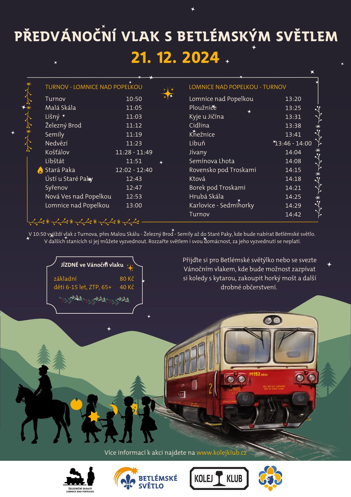 Vyjede z Turnova do Staré Paky, kde počká na příjezd Betlémského světla od Pardubic. Po jeho vyzvednutí se vypraví ze Staré Paky přes Lomnici nad Popelkou a Libuň do Turnova.