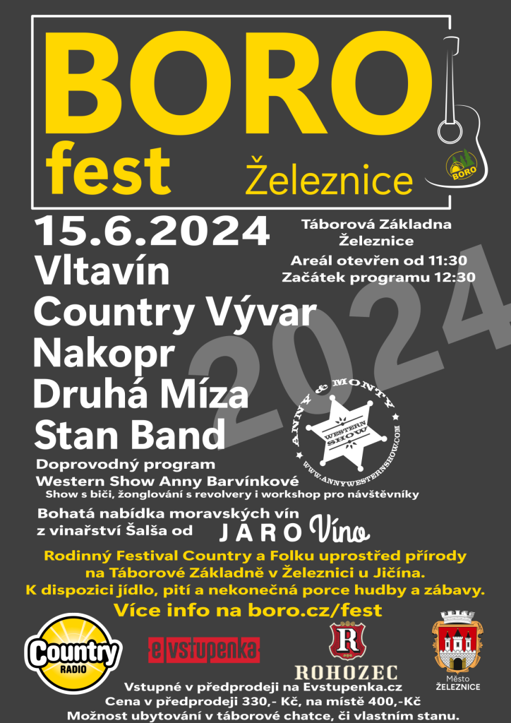 Volnočasová organizace BORO vás srdečně zve na rodinný festival country a folku uprostřed přírody BORO fest Železnice 2024, který se koná v sobotu 15. června od 12:30 hodin na táborové základně v Železnici. K dispozici je nekonečná porce hudby a zábavy a také chutné občerstvení.