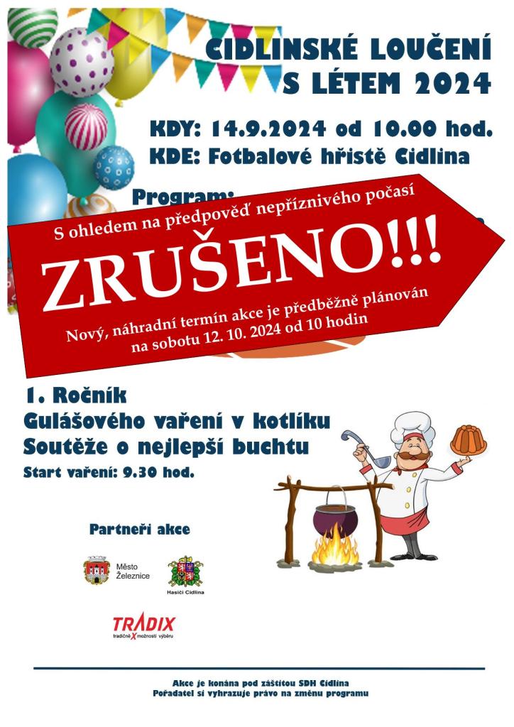 Z důvodu předpovědi nepříznivého počasí v sobotu 14. 9. se Cidlinské loučení s létem koná před budovou KD Cidlina, program zůstává stejný.