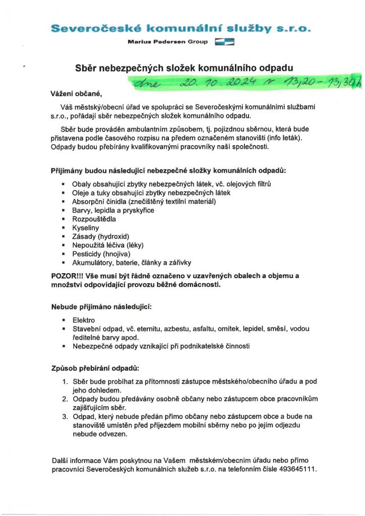 Sběr nebezpečných složek komunálního odpadu v neděli 20. 10. 2024