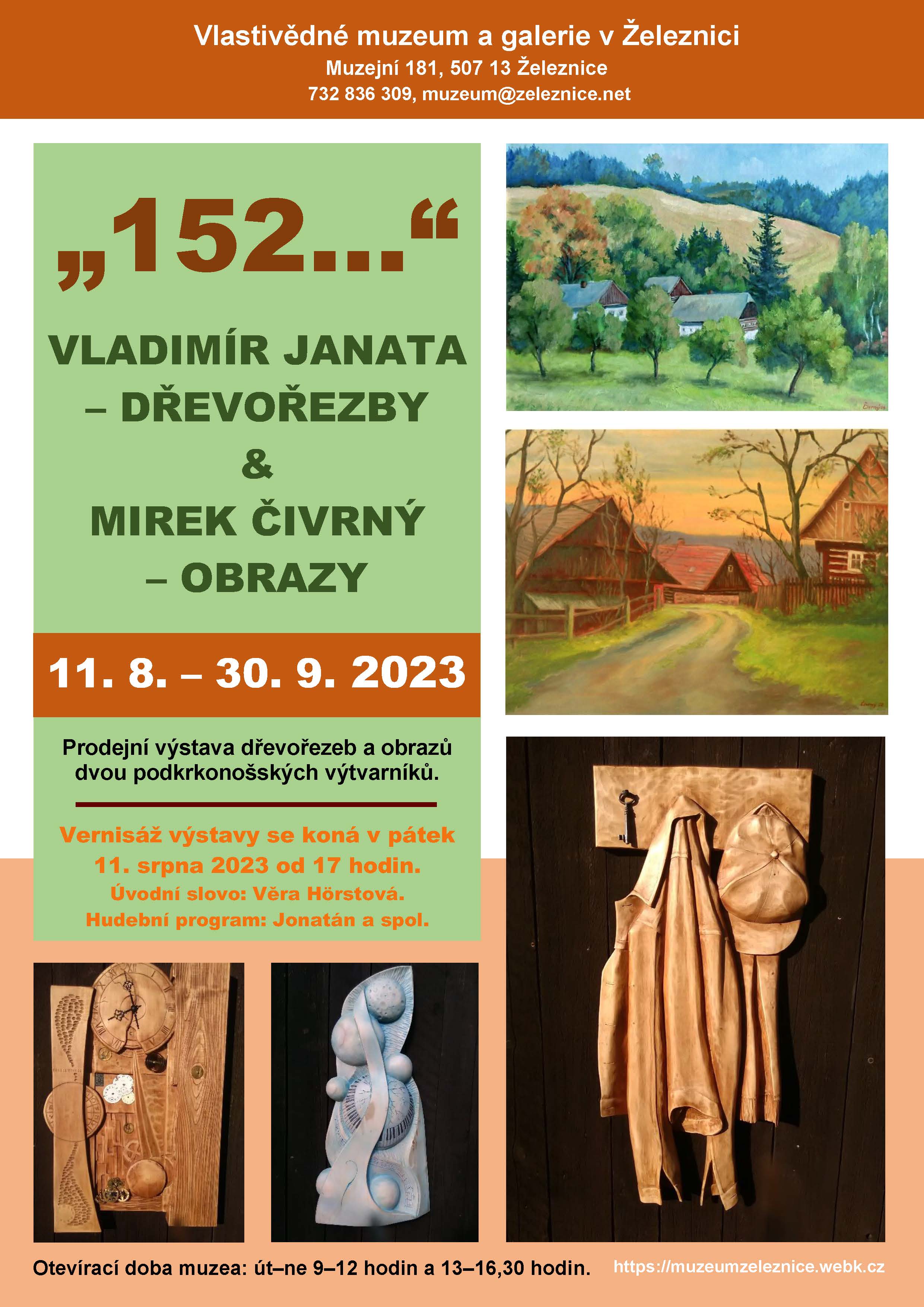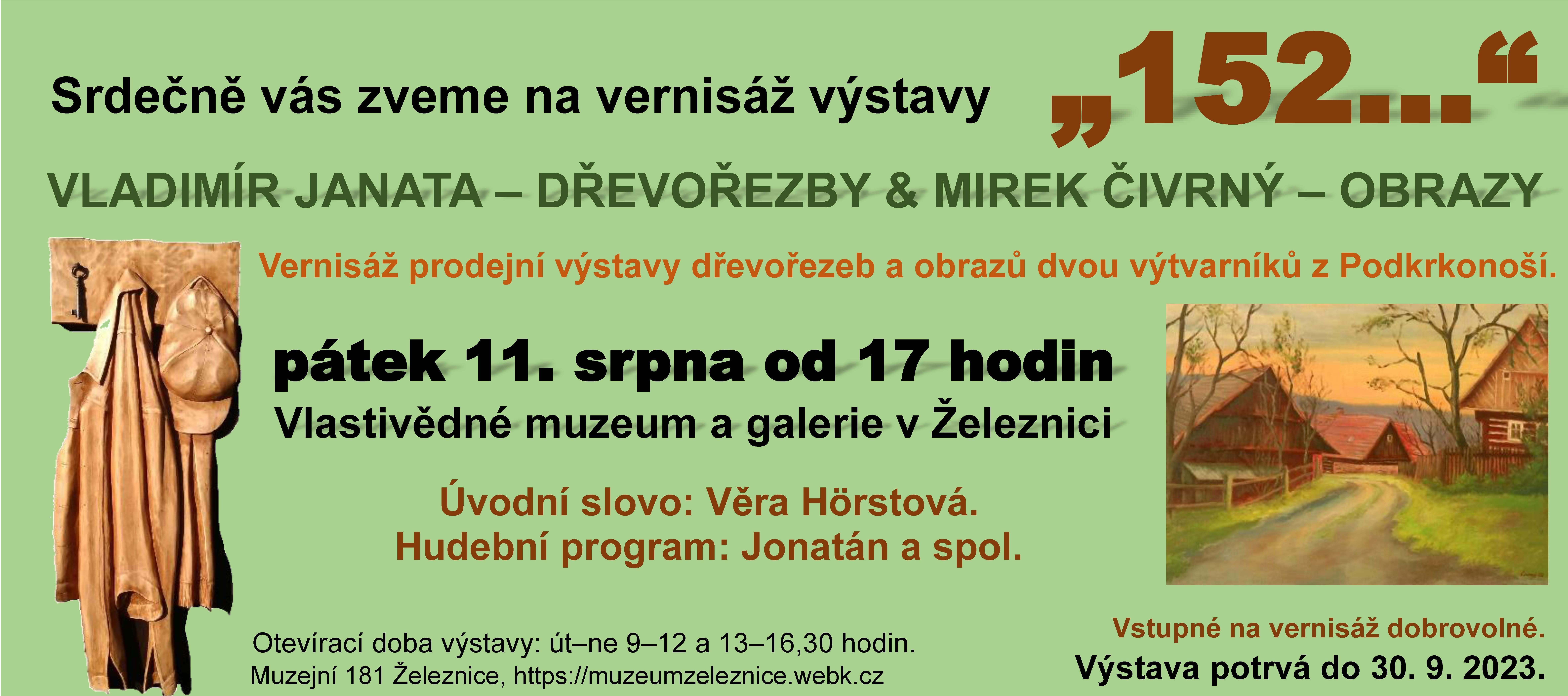 Prodejní výstava dřevořezeb Vladimíra Janaty a obrazů Mirka Čivrného.