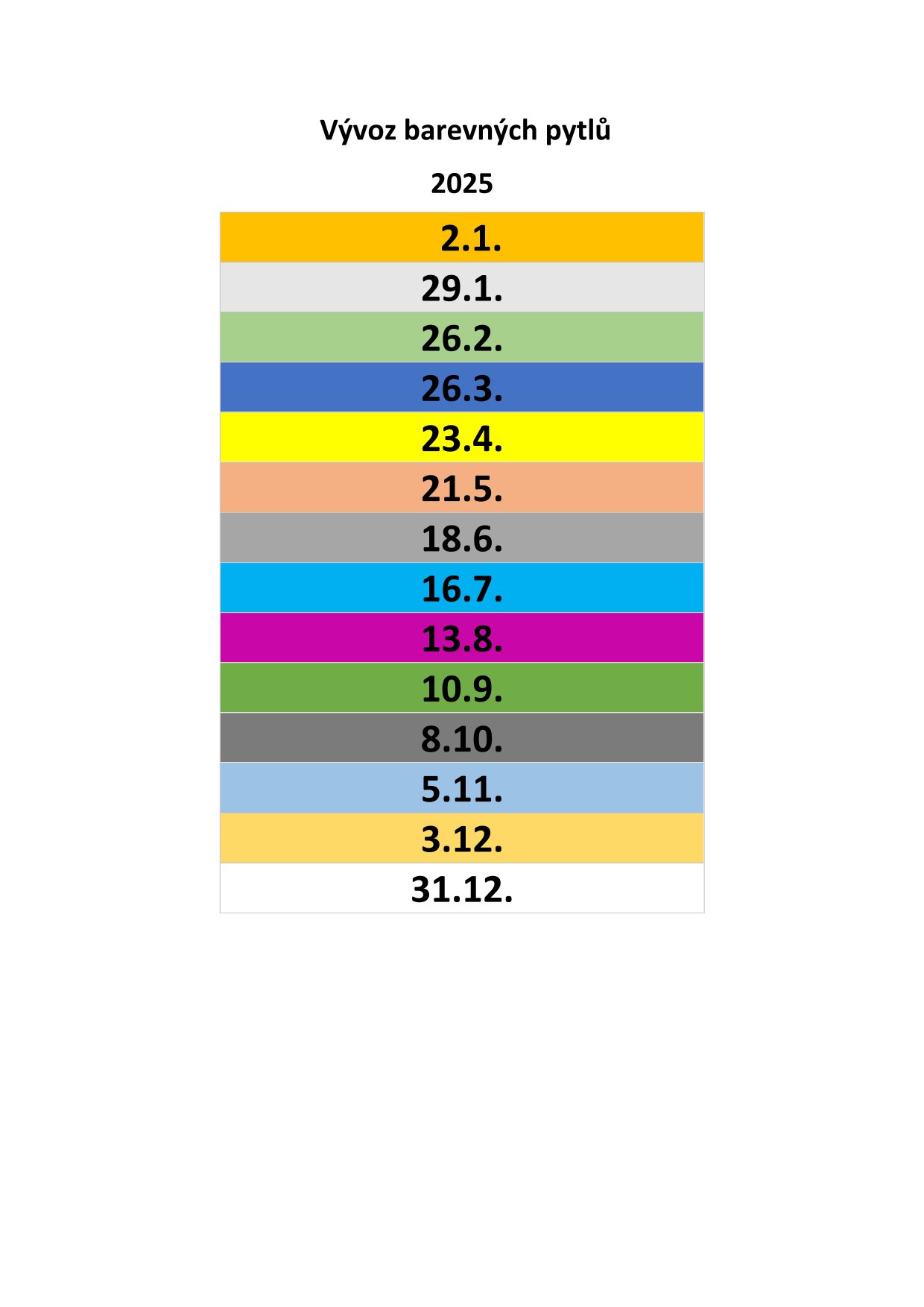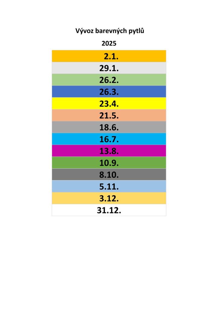 Vývoz barevných pytlů na tříděných odpad od domu je v roce 2025 v Železnici zajištěn nadále jednou měsíčně (v lednu a prosinci 2025 dvakrát). Konkrétní termíny naleznete v tabulce v příloze.