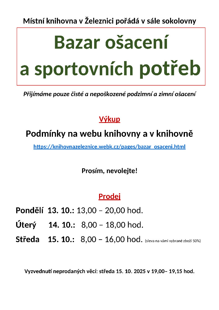 Chcete si nakoupit ošacení a sportovní potřeby za rozumné ceny? Navštivte tradiční podzimní bazar, který ve dnech od 13. do 15. října pořádá v sokolovně v Železnici městská knihovna. Prodejní doba: pondělí 13. 10. 13-20, úterý 14. 10. 8-18 a středa 15. 10. 8-16 hodin (sleva na vybrané zboží 50 %).