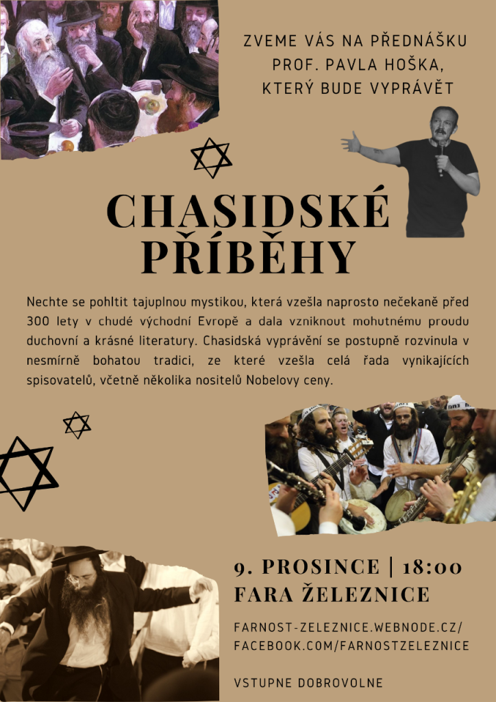 Srdečně zveme na večer plný příběhů a sdílení, večer plný chasidské moudrosti a nadčasových poselství Chasidské příběhy v podání prof. Pavla Hoška, který se koná v pondělí 9. prosince od 18 hodin na faře v Železnici. Vstupné dobrovolné.