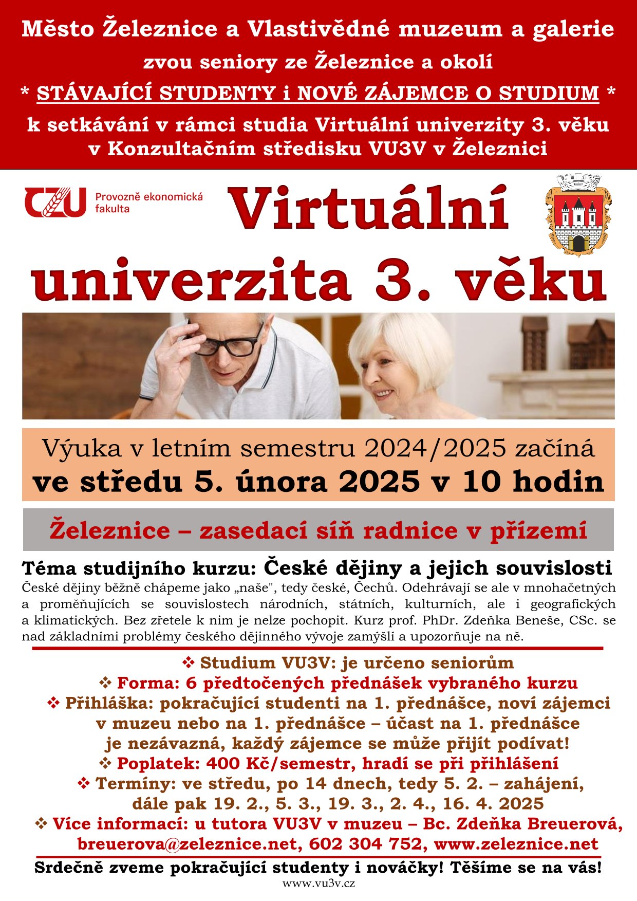 1. přednáška nového semestru výuky Virtuální univerzity 3. věku pro seniory ze Železnice a okolí, na kterou se noví zájemci o vzdělávání mohou přijít nezávazně podívat.