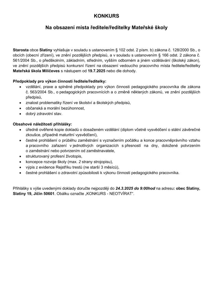 Starosta obce Slatiny vyhlašuje konkursní řízení na obsazení vedoucího pracovního místa ředitele/ředitelky Mateřská škola Milíčeves s nástupem od 19.7.2025 nebo dle dohody. Více informací v příloze.