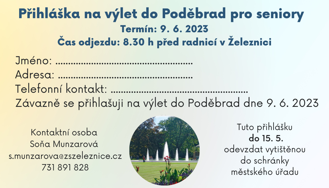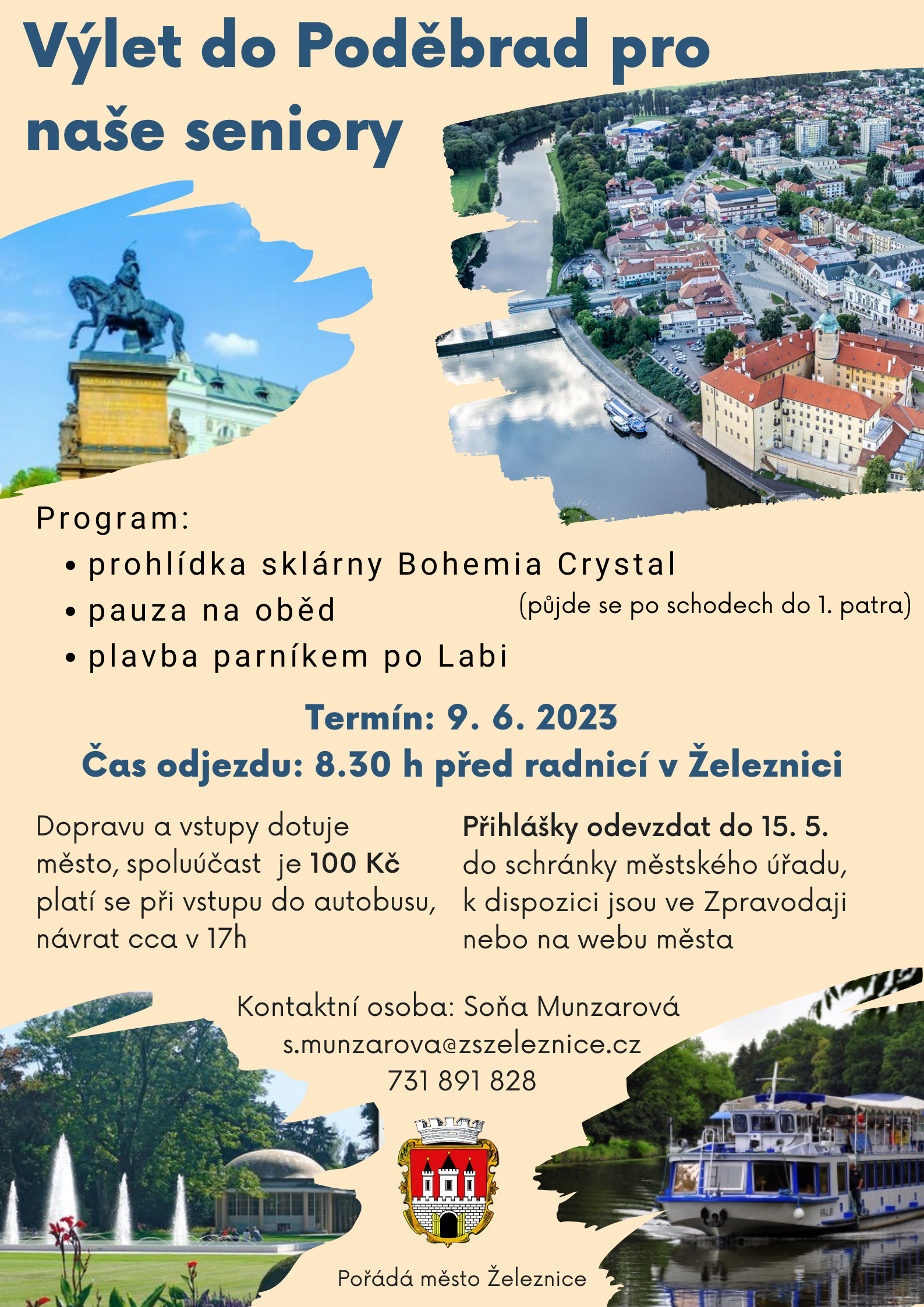 Město Železnice pořádá pro seniory výlet do Poděbrad 9.6. 2023, vice na přiložené pozvánce Přihlášky je potřeba podat do 15. 5. 2023