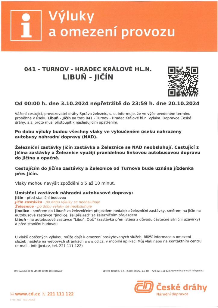 Správa železnici informuje, že ve dnech 3. – 20. 10. 2024 dochází k výluce na trati 041 (Turnov – Hradec Králové) dopravce ČD v úseku JIČÍN – LIBUŇ.