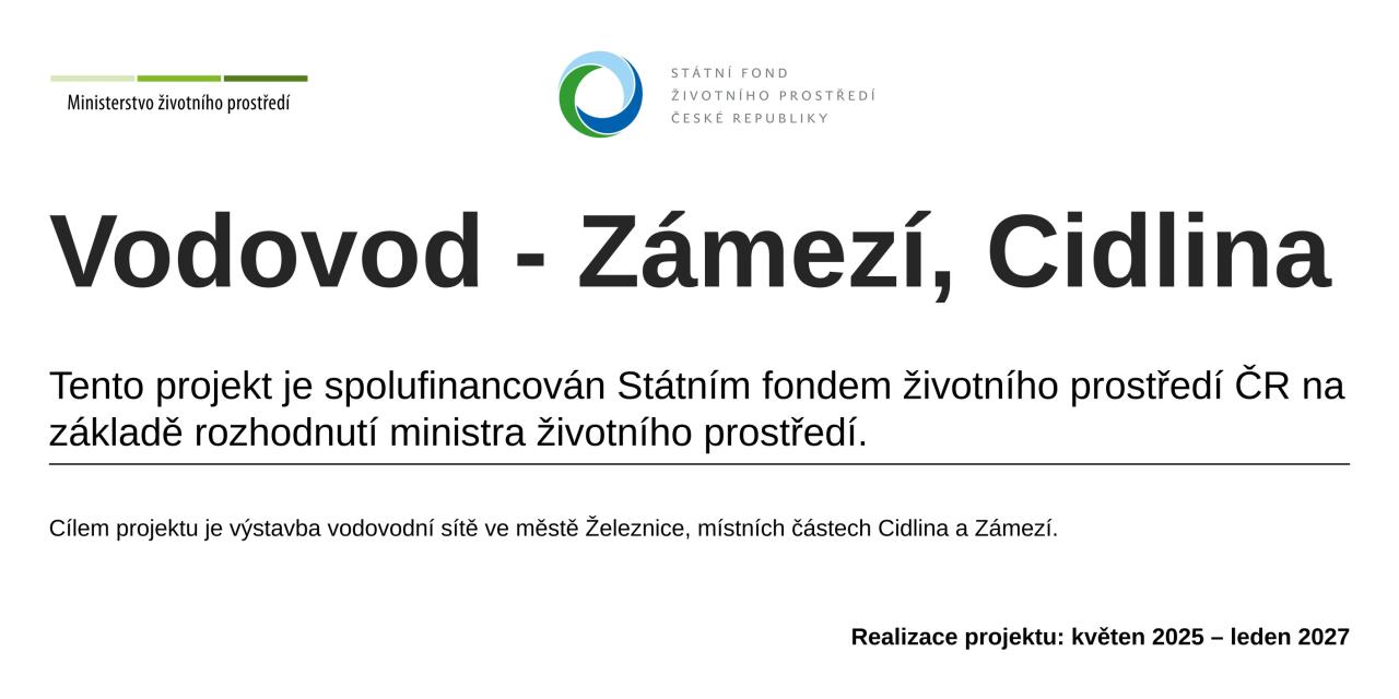 Obyvatelé Zámezí a Cidliny se konečně dočkají vytouženého vodovodu. Ekonomicky nejvýhodnější nabídku předložila firma VPK Suchý s.r.o., a to 35 453 000 Kč s DPH. Smlouva o dílo je podepsána, k předání staveniště a zahájení stavby dojde koncem května. Vodovod je spolufinancován SFŽP ČR s 60% dotací.