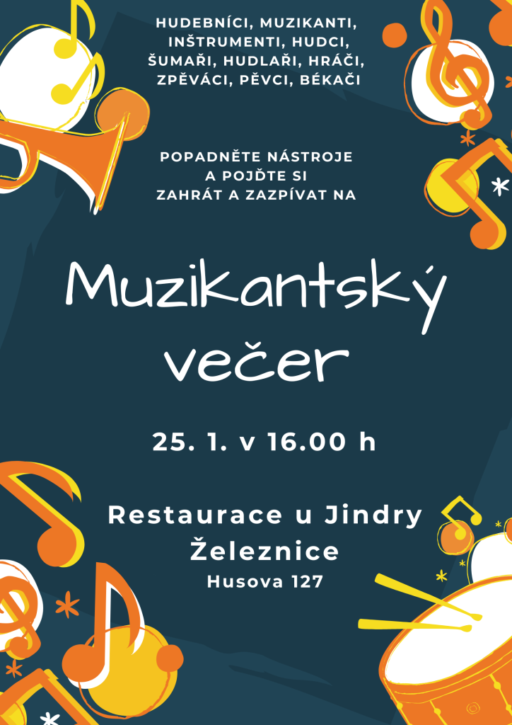 Zahrajte si, zazpívejte nebo se jen tak zaposlouchejte na open air MUZIKANTSKÉM VEČERU. Srdečně zveme zpěváky, hudebníky i všechny posluchače. Koná se v sobotu 25. ledna 2025 od 16 hodin v Restauraci U Jindry v Železnici.