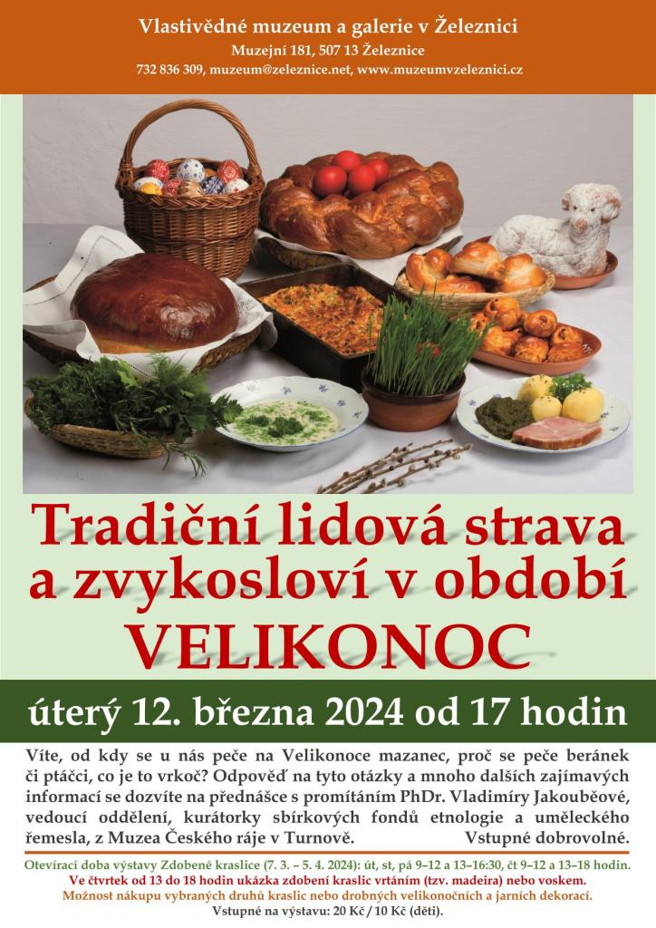 Srdečně vás zveme na přednášku s promítáním TRADIČNÍ LIDOVÁ STRAVA A ZVYKOSLOVÍ V OBDOBÍ VELIKONOC, se kterými vás v úterý 12. března od 17 hodin ve Vlastivědném muzeu a galerii v Železnici seznámí PhDr. Vladimíra Jakouběová z Muzea Českého ráje v Turnově. Vstupné dobrovolné.