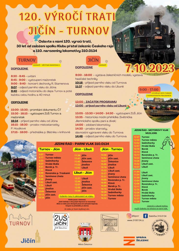 Železniční trať Jičín - Turnov si letos připomíná 120 let od svého zprovoznění. Nenechte si ujít oslavu tohoto významného výročí v sobotu 7. října. Připraven je bohatý program (více informací na plakátu) včetně jízd parního vlaku. Tak plnou parou vpřed!