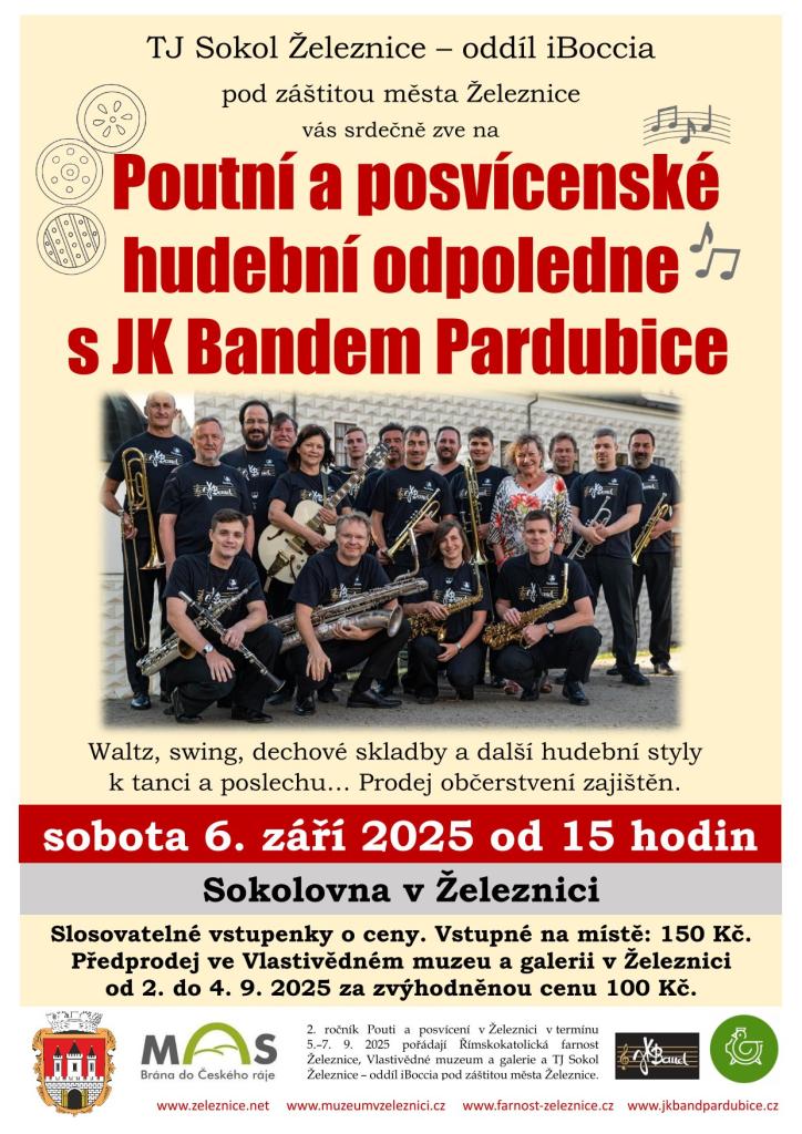 Předprodej vstupenek ve Vlastivědném muzeu a galerii v Železnici od 2. do 4. 9. 2025 za zvýhodněnou cenu 100 Kč. Otevírací doba muzea: 9 - 11:30 a 13 - 16:30 hodin.