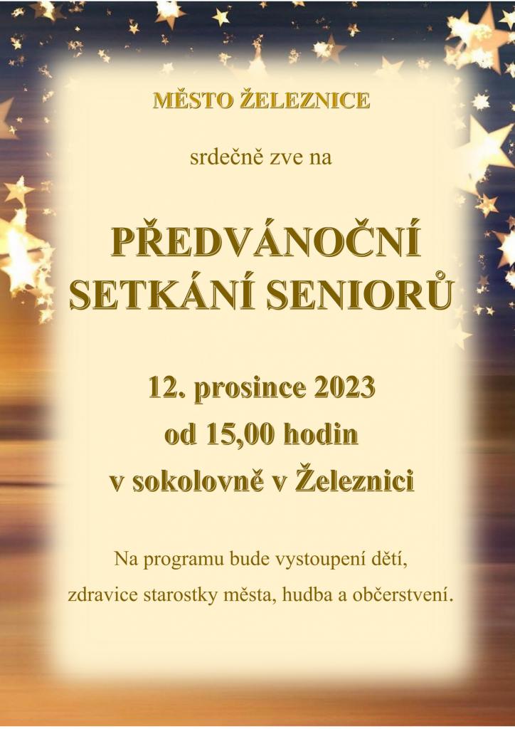 Město Železnice vás srdečně zve na Předvánoční setkání seniorů, které se koná v úterý 12. prosince od 15 hodin v sokolovně v Železnici. Program: vystoupení dětí, zdravice starostky města, hudba a občerstvení. Přijďte se společně setkat ve svátečním adventním čase, těšíme se na vás.