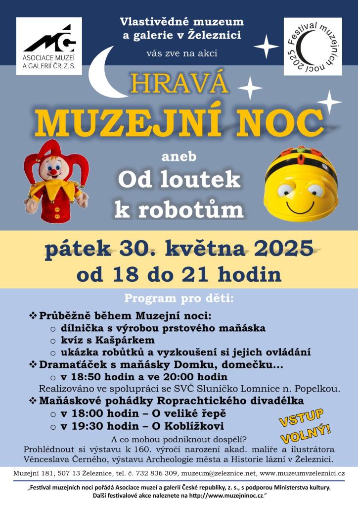 Muzejní noc 2025 - tradiční muzejní akce Asociace muzeí a galerií ČR s bohatým programem pro nejmenší návštěvníky: hry, kvíz, soutěže, ukázka robůtků, maňáskové pohádky v podání Roprachtického divadélka ad. Více na www.muzeumvzeleznici.cz. Realizováno ve spolupráci se SVČ Sluníčko Lomnice n. Pop.