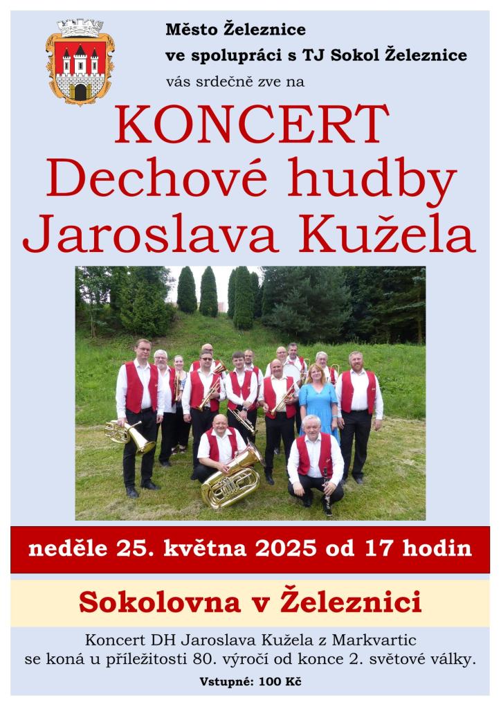 Město Železnice ve spolupráci s TJ Sokol Železnice vás srdečně zve na Koncert Dechové hudby Jaroslava Kužela z Markvartic, který se koná u příležitosti 80. výročí od konce 2. světové války v neděli 25. května 2025 od 17 hodin v sokolovně v Železnici. Vstupné: 100 Kč.