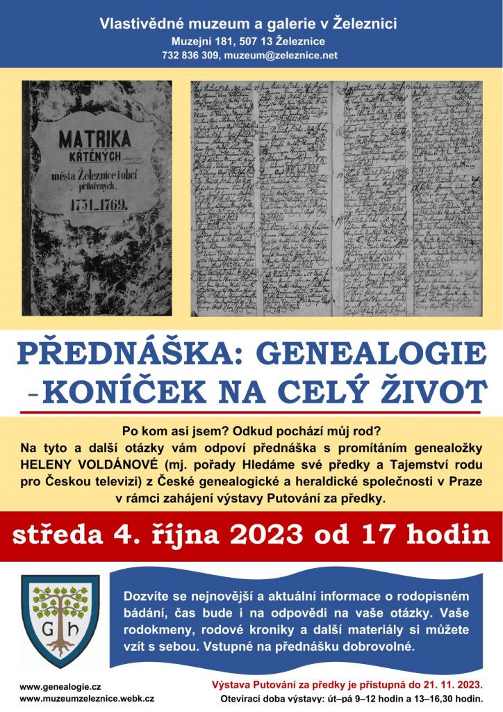 Po kom asi jsem? Odkud pochází můj rod? Na tyto a další otázky vám odpoví přednáška s promítáním genealožky Heleny Voldánové (mj. pořady Hledáme své předky a Tajemství rodu pro Českou televizi) z České genealogické a heraldické společnosti v Praze v rámci zahájení výstavy Putování za předky. Dozvíte se nejnovější a aktuální informace o rodopisném bádání, čas bude i na odpovědi na vaše otázky. Vaše rodokmeny, rodové kroniky a další materiály si můžete vzít s sebou.
