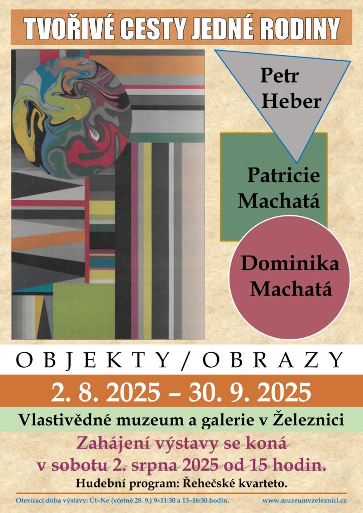 Výstava uměleckých objektů Petra Hebera, známého autora z Jičína, a obrazů jeho dcery Patricie Machaté a vnučky Dominiky Machaté. Zahájení výstavy se koná v sobotu 2. srpna od 15 hodin. Úvodní slovo: Petr Heber. Hudební program: Řehečské kvarteto.